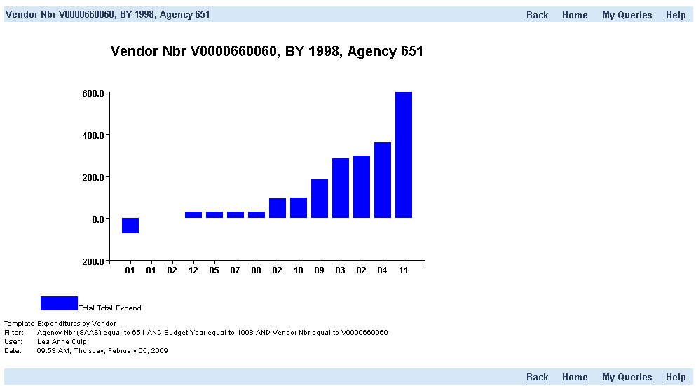 Lesson 6 is not an interactive lesson, rather it is requires you to print this page and then to follow the directions to do a chart using the Expenditures by Vendor template. In Lesson 4, you created a report that examined expenditures summarized by month during the budget year 1998 for a vendor for Agency No. 651. Now you would like to create a chart showing that same information for Vendor No. V0000660060. You will create this report using "live" data. Since you want to see a report summarizing expenditure information by vendor, click the Expenditures by Vendor template. Query Information Screen In your final report, you want to see only the Total Expend and Accounting Month. However, you want to filter on the Budget Year, Vendor Nbr and Agency Nbr (SAAS), so all five of these columns must be checked on the Query Information screen. In addition you want to group by the accounting month and select chart as the output type. 1. Click in the check boxes by the columns listed above. Grouping Options Screen Select the columns you want to group the data by and determine how you want the result calculated. 1. Click all columns under Choose the columns to group. Filter Options Screen This report requires creating three filters. 1. Create a filter to restrict your report to Agency Nbr 651. Chart Options Screen Filters will appear at the bottom of your chart, but you might want to also enter them in your title. On this screen, you will choose the chart type and the columns to use for the X and Y axes. There are many other formatting options at the bottom of this screen which you can explore later. 1. Enter Vendor Nbr V0000660060, BY 1998, Agency 651 in the Title box. Query Report Screen Your trend chart shows the expenditures for one vendor over a year's time. |
